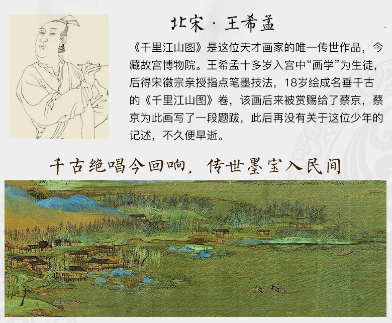 《千里江山图》采用中国繁博有序的古法技艺,1:1精密手绘,极具收藏价值。
