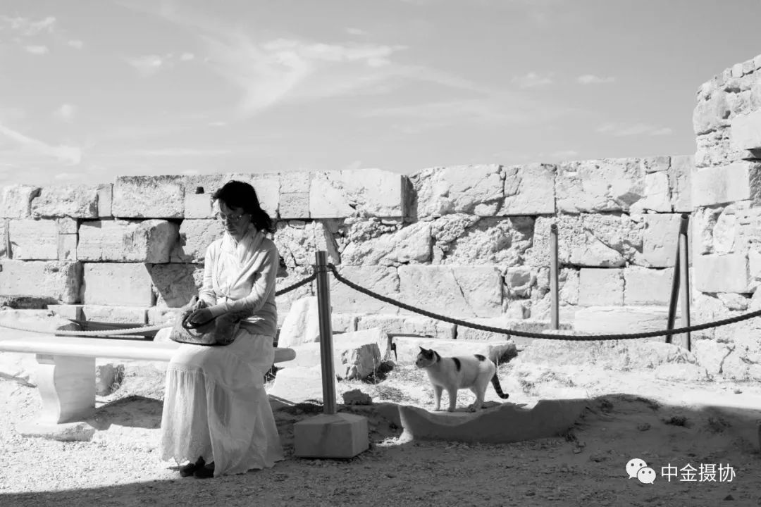 2016年9月24日,摄于希腊雅典卫城。古城遗迹下坐着一个女人,与之相望的另一座神庙顶上镌刻着“认识你自己”的箴言。